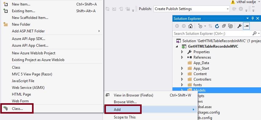 Now let us create the model class file named OrderModel.cs by right clicking on model folder as in the following screenshot: