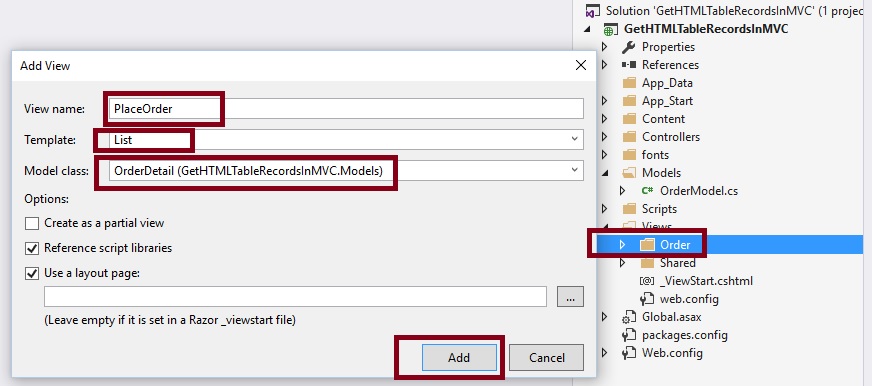 Creating strongly typed view named PlaceOrder using OrderDetail class. Right click on View folder of created application and choose add view, select OrderDetail model class and scaffolding template List as,
