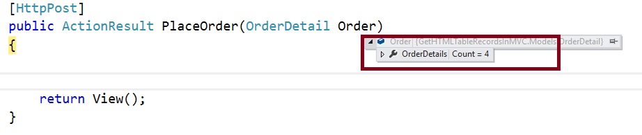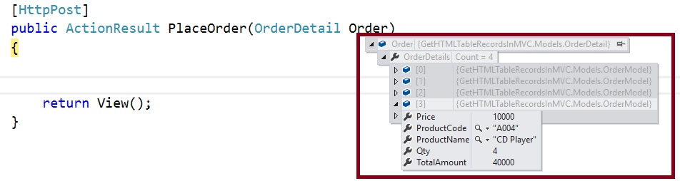 In preceding table we are adding orders (records) dynamically. Put break point on PlaceOrder action result method and click on