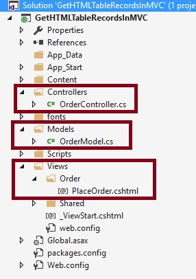 Now after adding the Model, View and controller into our project. The solution explorer will look like as follows,