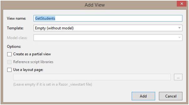 We have defined a List of Students and populated it with data. We would be passing this data to the View. Since we do not have a views we will create a View. Right click on GetStudents() method. Go to Add->View. Select the empty template. Click Add.