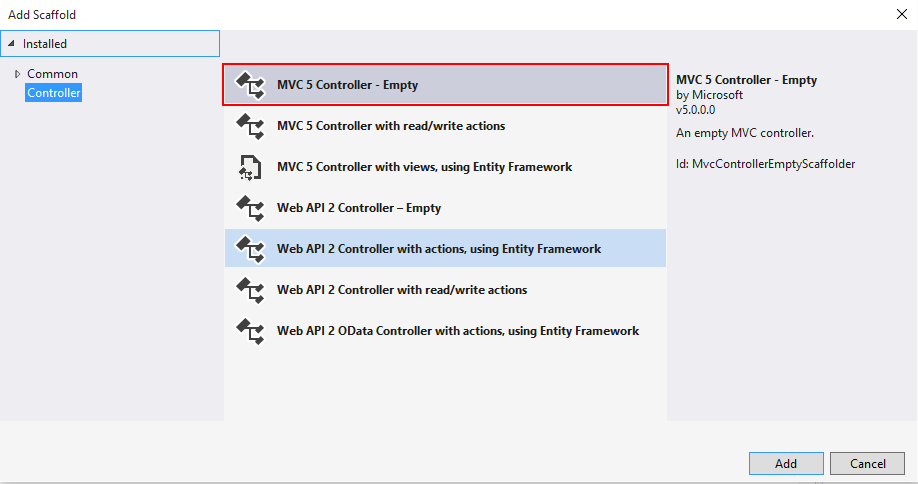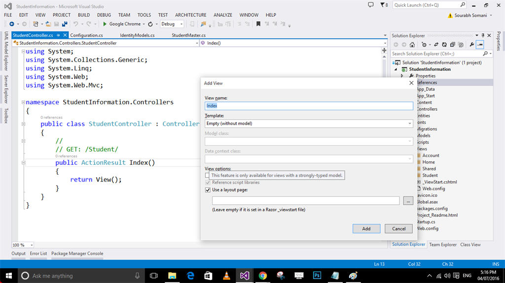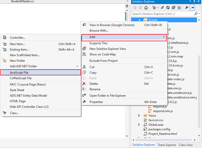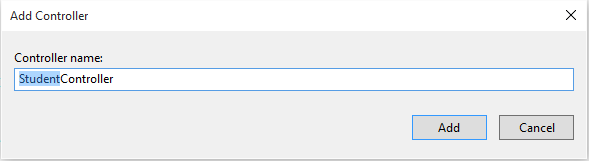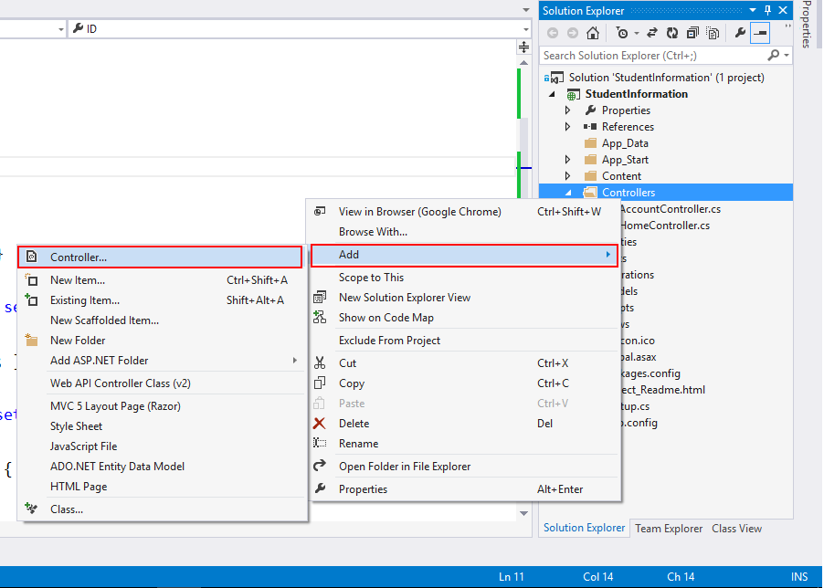 13. Now add Controller with name "StudentController". To add controller in your project right click on Controllers folder, Add, then Controller. Here's the figure to add StudentController.