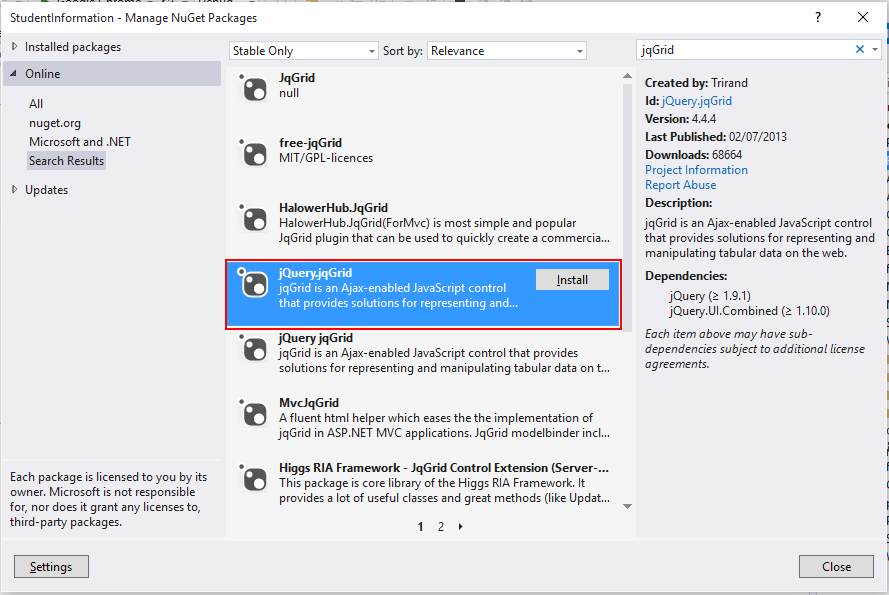 14. Now Install jqGrid Package from the Nuget Package Manager. To add jqGrid package from the Nuget package Manager,