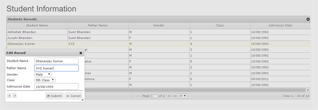 Editing a Record: For Editing a record you have to select one row and click on Edit Button.