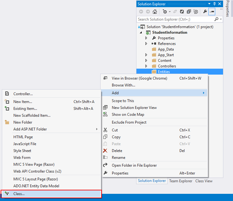 Entities folder with Name "StudentMaster.cs". You can follow the below figure to add class: