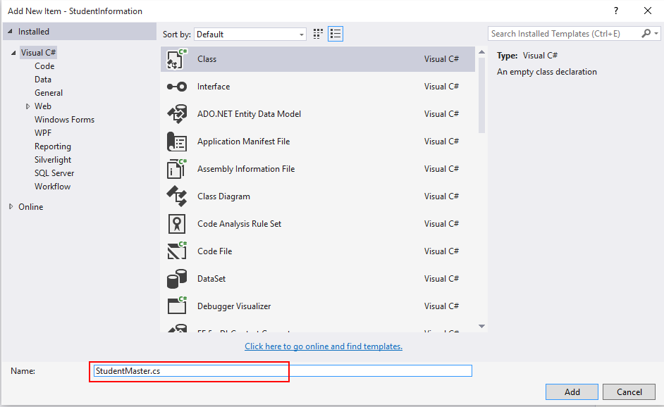 Now one dialog box will be open give the name for that class as "StudentMaster.cs".
