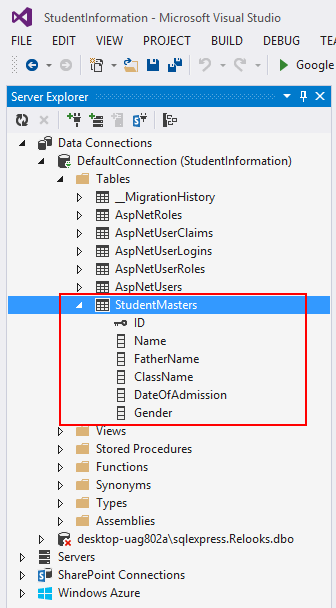 12. After writing above code you can open your server explorer (By pressing CTRL + ALT + S) and can see your table StudentMaster with fields which we have entered inside
