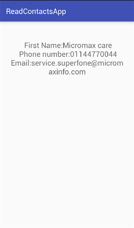 We can see that all the three things like name , phone no., and email have been fetched. It is showing one record because I have only one phone number in my contacts and phone.