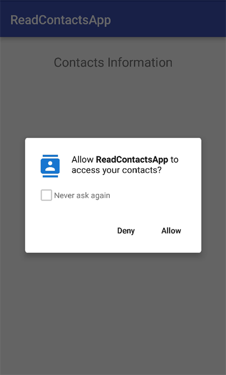 Running the Application On Running it in Marshmallow we can see that it is asking for permission to Read the Contacts. If you deny nothing happens and contacts will not be seen.