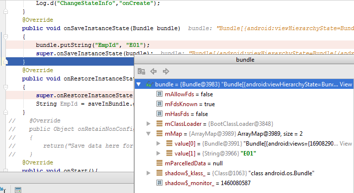 If you want to persist the state of an activity so that it can be restored later, when the activity is recreated (when the device changes orientation), a much simpler way is to implement the onSaveInstance() method, as it provides a Bundle object as an argument, so that you can use it to save your activity’s state. The code given below shows that you can save the string ID into the Bundle object during the onSaveInstance() method.