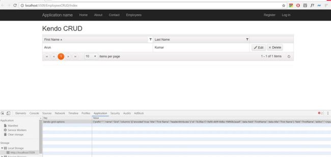 When the page loads, we are going to check whether there is any local storage or not. If the local storage [“kenod-grid-options”] exists, we are going to load it as a datasource for Kendo Grid, using the setOptions function.