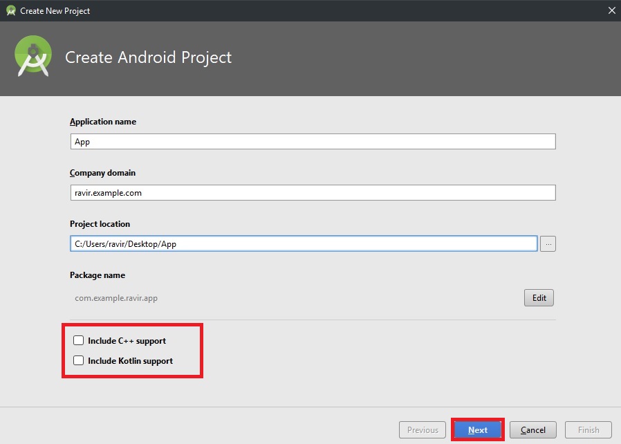 Open Android Studio and create a new project. Give an application name, company domain, check "include C++" option if you wish to use C++ for coding the project, and click "Next".