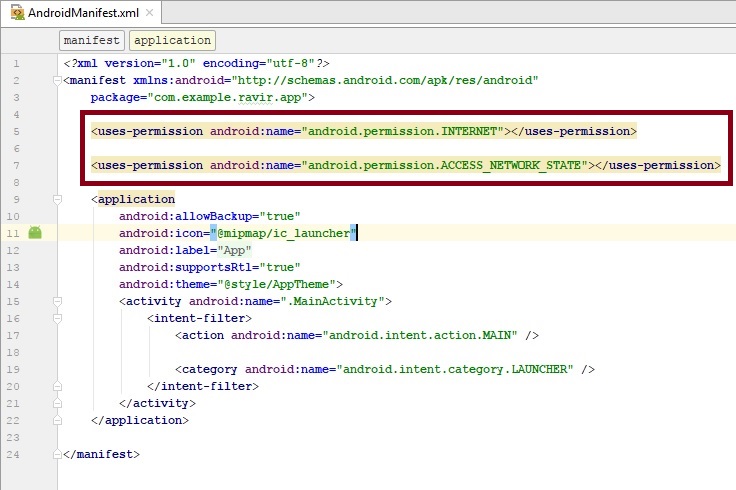 The XML code will apppear. Just enable or activate the INTERNET and ACCESS_NETWORK_STATE permissions.