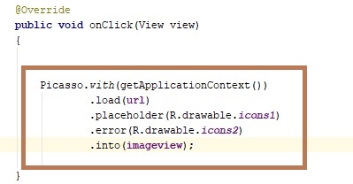 Next, in the following Picasso code, replace the MainActivity Page <onClick> tag.