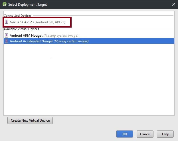 Next, go to Android Studio and deploy the application. Select deploymet target.