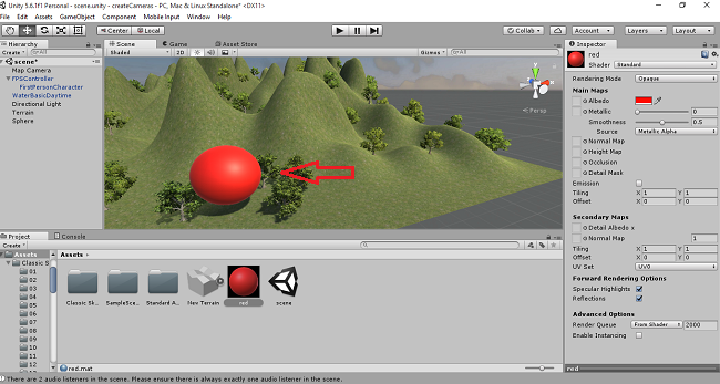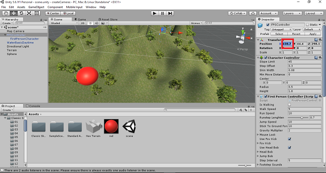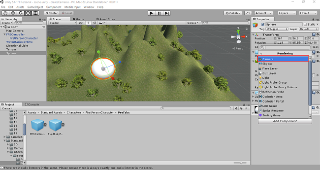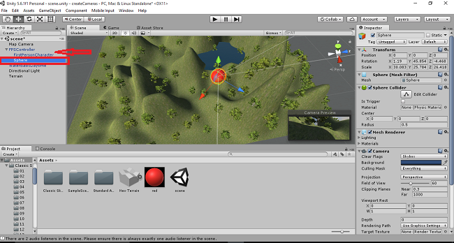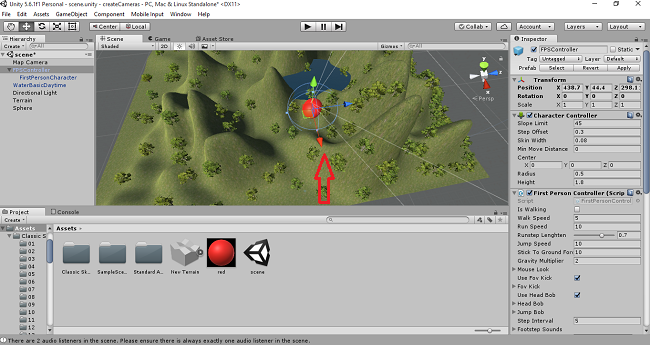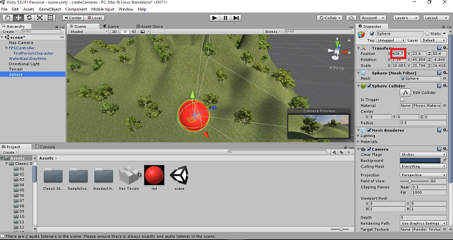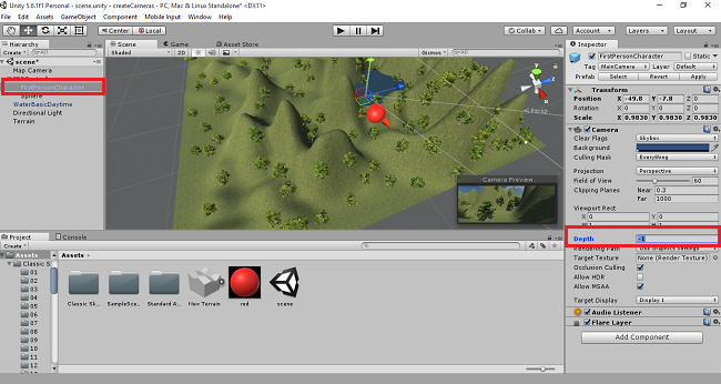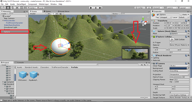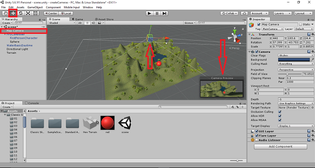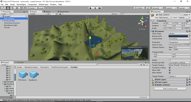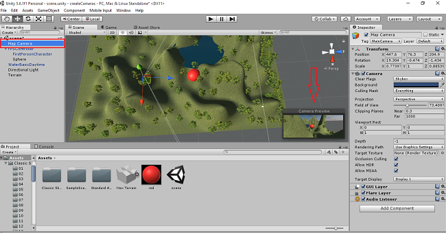 First, you have to create the terrain, trees, and water. Add the first person controller in your project. Select the Main camera. Go to inspector window and change the name into map camera.