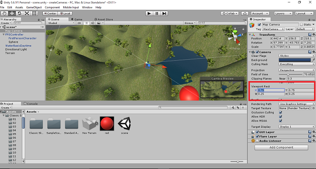 Click on the Map camera; go to the inspector window, and select the Viewport Rect. Give x-axis, y-axis values as 0.75 and 0.25 respectively.