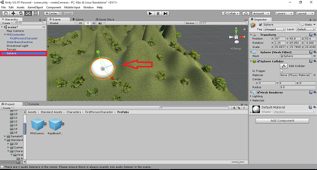 Click on the FPS Controller. The first person character will be displayed. Click on the First person character.
