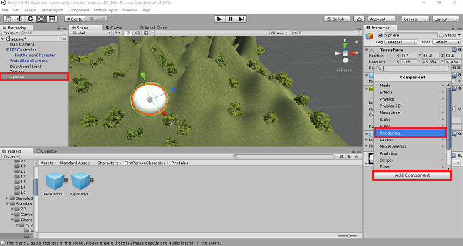 Select the sphere and go to "Add component". Click on the add component and select Rendering.