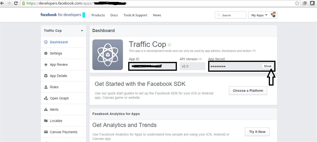 After following above steps, we will be redirected to the following screen. On this screen we can see App Id and App Secret in two fields at the top. App Secret is in password format. Click the “Show” button, this will display App Secret Key.