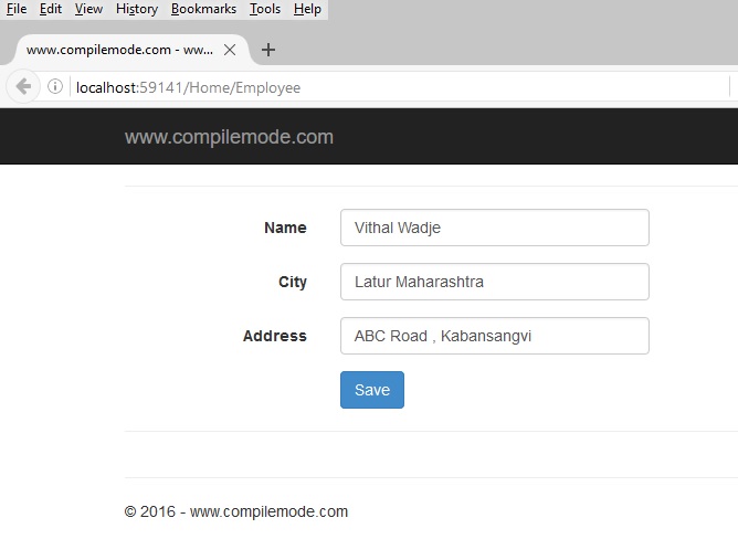 Now open the Employee.cshtml view and create the following jQuery Post method to call controller.