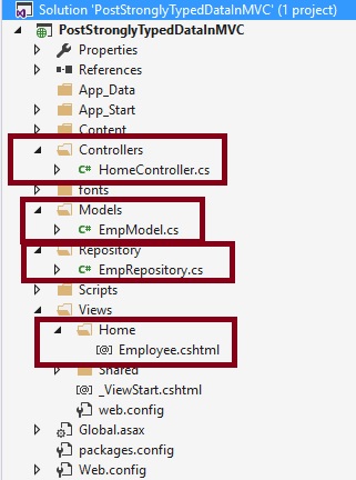 After adding model, view , controller and Repository folder our final solution explorer will be look like as follows,