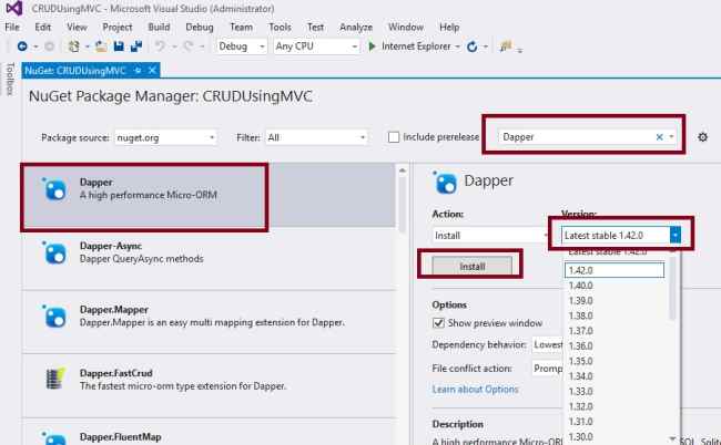 Now next step is to add the reference of Dapper ORM into our created MVC Project. Here are the steps: