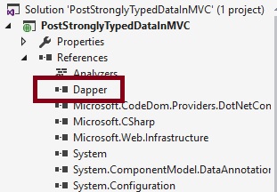 After installing the Dapper library, it will be added into the References of our solution explorer of MVC application such as: