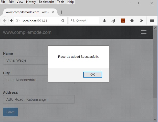 Now click on save button, It will shows the following message after successfully inserting data into database as,