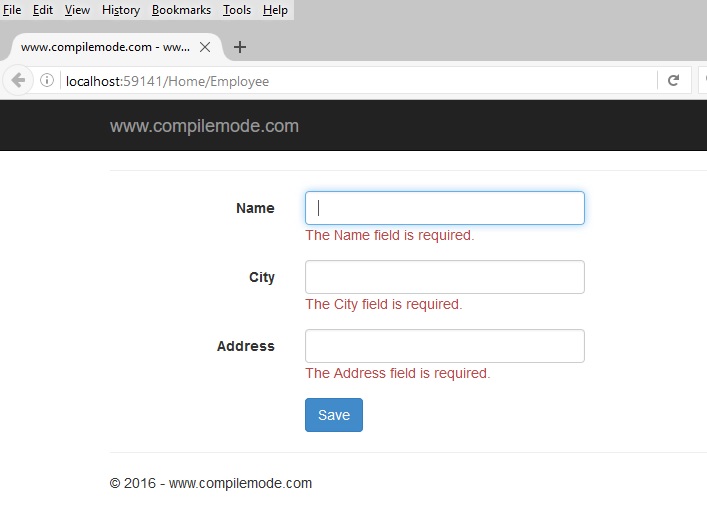 Now click on Add save button without entering the details then the following error message shows which we have defined in model class as,