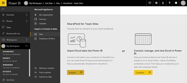 For that, go to My Workspace => Get Data => Files => SharePoint.