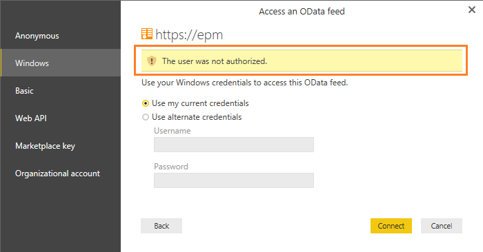 In case the current user is not authorized to connect to the site, you will be prompted to set the right credential as shown below.
