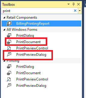 In Toolbox, we have to add Print Dialog & Print preview. Just Drag & Drop in the form.