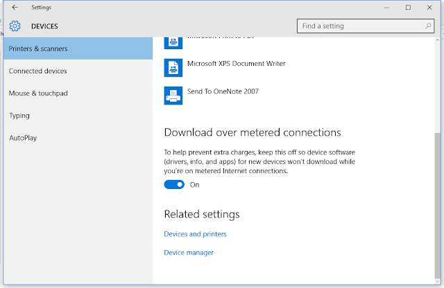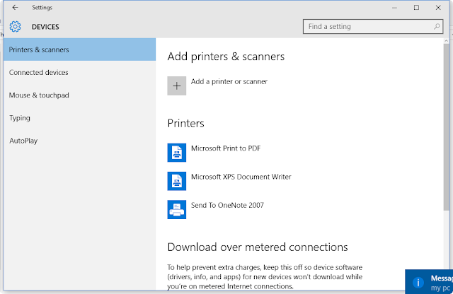 Let's move on to the steps of finding the list of printers registered and also how to add printers. Here's the procedure followed. Step 1: Go to Settings option in Windows 10. Step 2: Under Settings go to Devices. Step 3: Under Devices go to "Printers and scanners" option. Step 4: List of Printers available is displayed and we can add the printer in our network with the "+" icon. Step 5: There is an option of validating the inflow of data and data access via internet using the option metered internet connections (It should be set to ON).