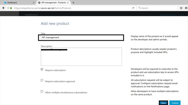 Provide a name for the new product in title text box & in the description text box ->provide a description about the API management and make sure the subscription is selected before clicking->save.