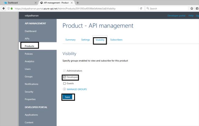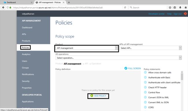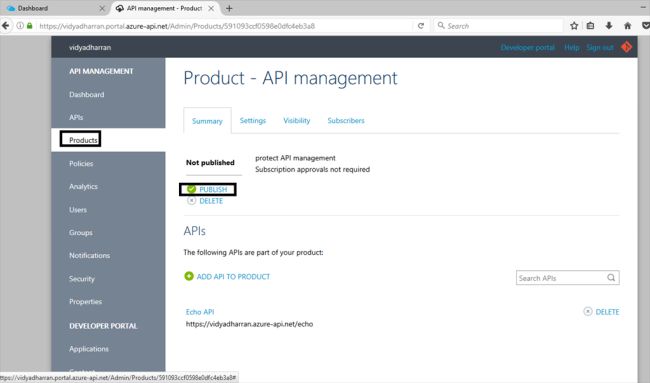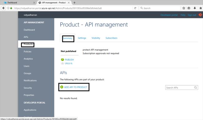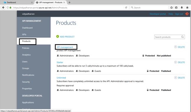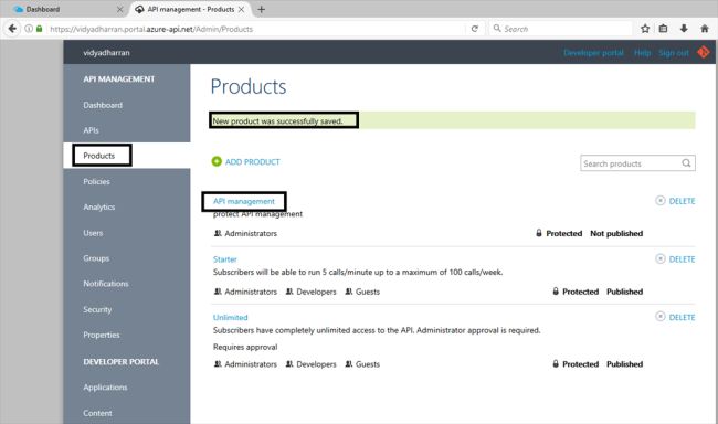 The API will be added & so that the policy is configured. The product can be published, so it can be used by developers. Click->Products from API management and click->API management