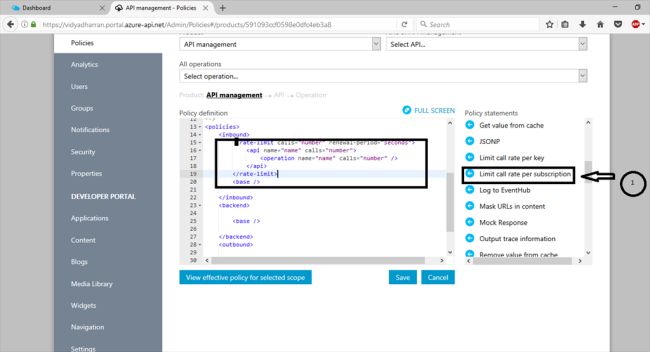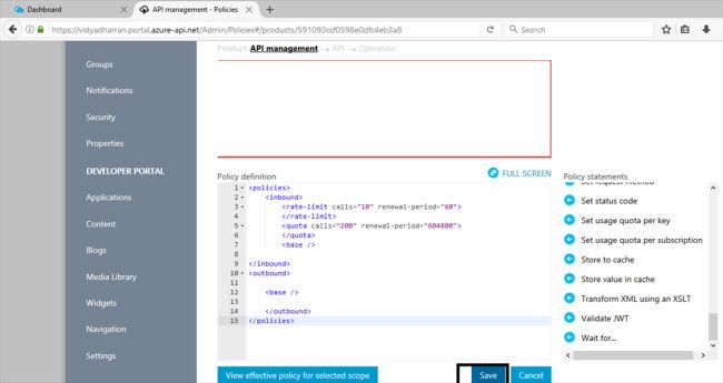 For inserting the policies, position the cursor into inbound and outbound. The policy template and rate limit and quotas policy are inbound policies, so that the position of the cursor is in inbound element. The two limit policies were added and they are,
