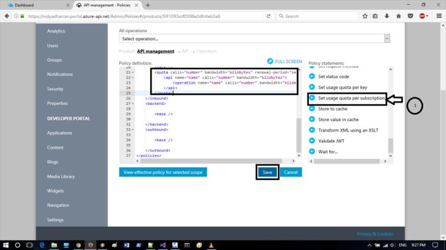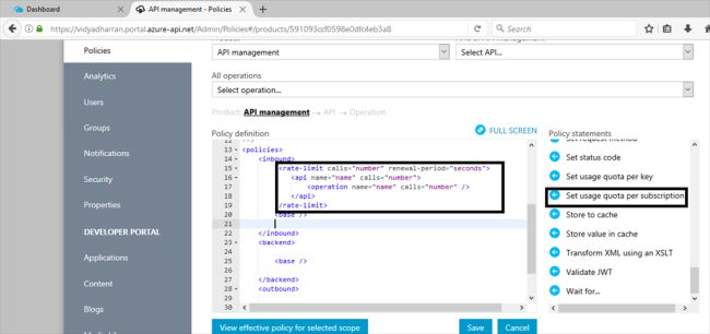 For configuring the set usage quota per subscription policy the position will be added of rate-limit element within the inbound element. click-> set usage quota per subscription.