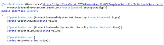 If we are defining our protection level at the top level, it is applicable till the root level unless otherwise if we are overriding it in the root level . You can define it like ProtectionLevel is EncryptAndSign in the top level (Service Contract) and override it in the bottom level (Operation Contract) like ProtectionLevel is None. The developer has a flexible approach for controlling the message protection across all levels.Declaration