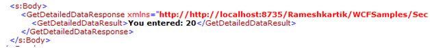 In the above snapshot you can find out if the protection level has to be declared over the service method. For the method GetStringData I have made it as a Sign, because I don’t care about the confidentiality here, but I care for the message integrity, that’s why I have chosen Protection Level. Sign. For the GetDetailedData method I have set the Protection Level as ProtectionLevel. None, though my service contract Protection Level is configured as ProtectionLevel. EncryptAndSign because I don’t want to protect this method’s message on the wire.For the GetIntData method, I didn’t say anything about the Protection Level, Then What will be the Message Protection Level? Of course it will take the Protection level we said in the Service contract level.ProtectionLevel.NoneThe following is the snapshot of the message flow if we set the ProtectionLevel.None.