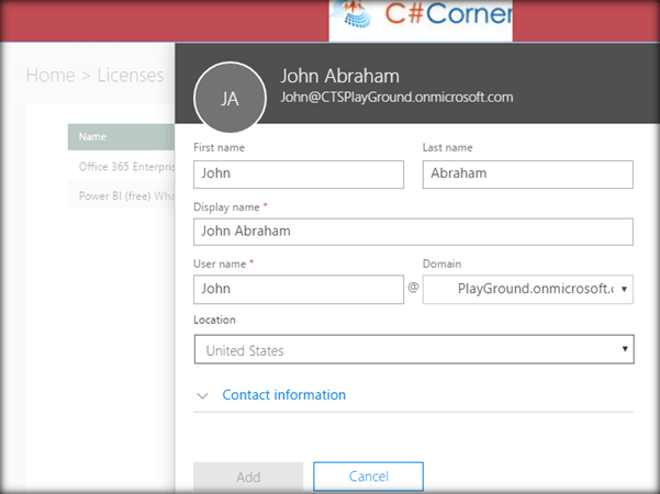 Click on ‘Add’. It will add the user to the Office 365 subscription. However, unless you have already purchased a license that can be assigned to the user, the Add button will not become active. Currently, my extra licenses have already been assigned to users and I will have to buy a new license before adding the new user.
