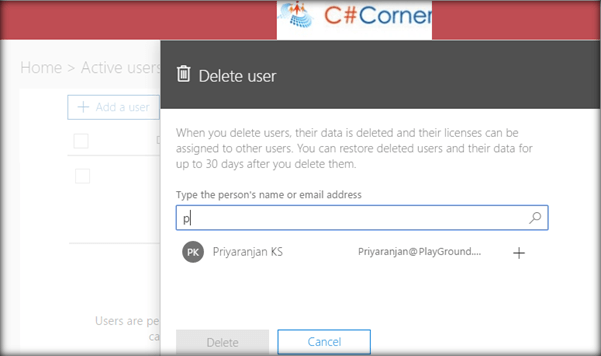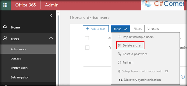 Similarly, we can remove the user by logging into the office 365 admin center .From the Users section, select ‘Active Users’. Select the More drop down and click on “Delete a user’.