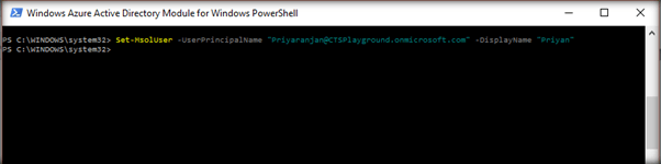 Set-MsolUser -UserPrincipalName " [email protected]" -DisplayName "Priyan"