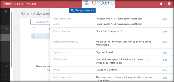 We can also edit the properties of an existing user directly from the Office 365 Admin Center by going to the Active Users section. It will list out all the users present within the subscription. Select the check box against the user which will open up a pop up page where we can edit the user properties like setting an alternate email, change display name, change password etc.