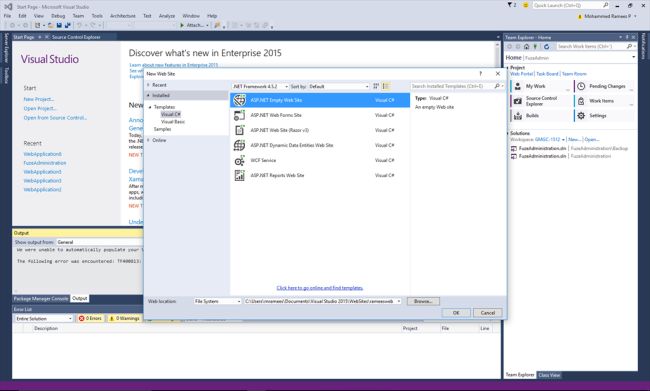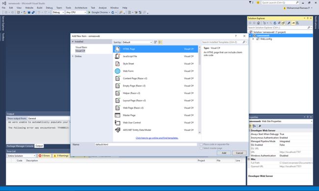 Now, you can see a solution called rameesweb has been created, which has nothing with it. Thus, let us add a new Web page by right clicking on the project name in Solution Explorer and Adding New Item from which you can select an HTML page and give a name to it. Here, I am giving default.html because we need not to call the Webpage as default.html as the Website will pick it up directly.