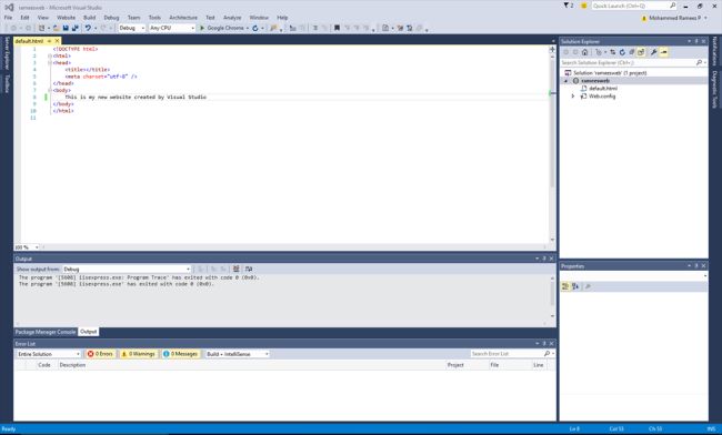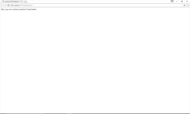 It will bring up a basic HTML page, where you can add your own content. Here, I am just adding a sample text “This is my new Website created by Visual Studio”. You can test it by running it locally to see how it looks. Local host is something like a tiny Web Server.