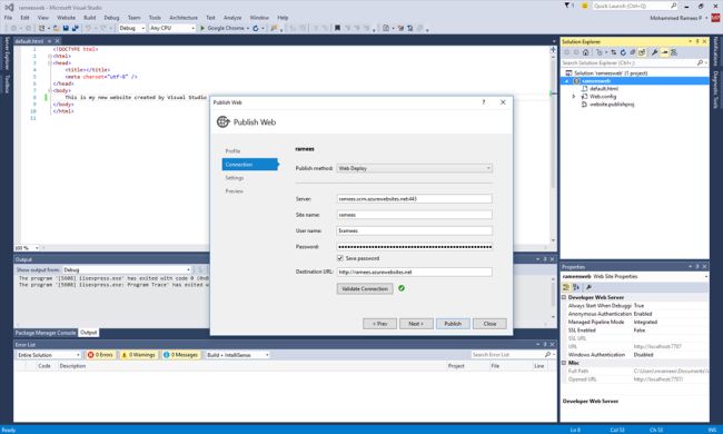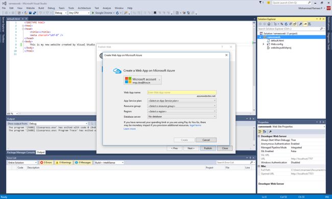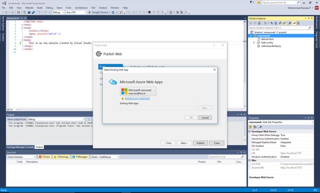 By using Visual Studio, you can create and publish your Web app to Azure. Here, I will show you how to create a simple Webpage and publish to the site, which we already created in the previous article.