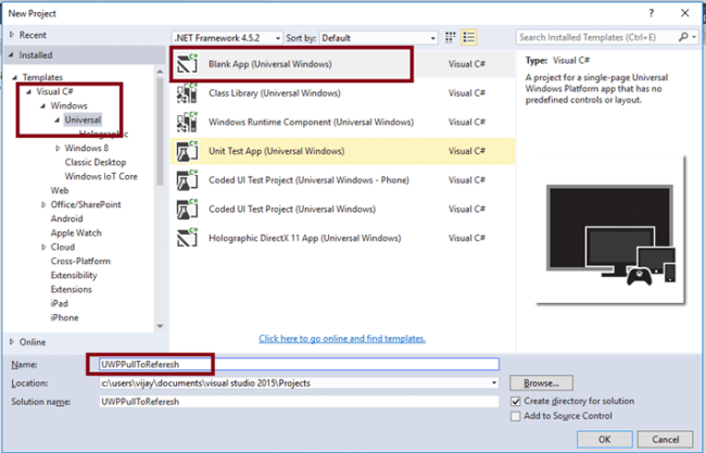 Step 1 - Open Visual Studio 2015 -> Start -> New Project-> Select Universal (under Visual C# -> Windows) -> Blank App -> give it a suitable name (e.g. - UWP PullToReferesh) -> OK.