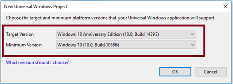 Step 2 - Choose the Target and Minimum platform versions that your Universal Windows application will support.
