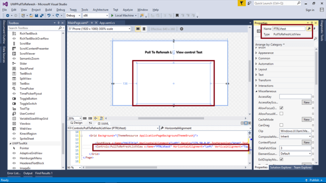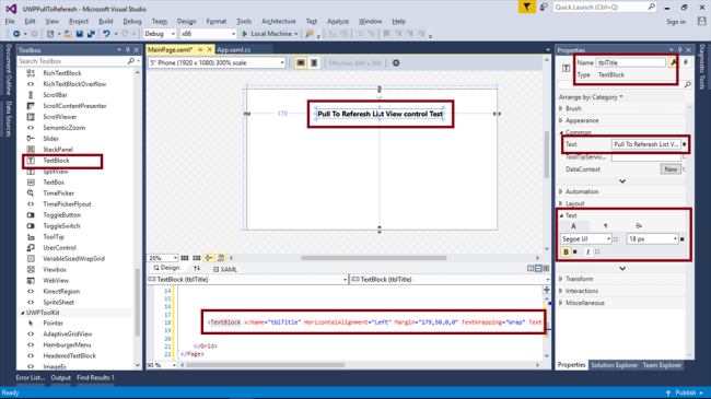 - <TextBlock x:Name="tblTitle" HorizontalAlignment="Left" Margin="179,50,0,0" TextWrapping="Wrap" Text="Pull To Referesh List View control Test" VerticalAlignment="Top" FontSize="18" FontWeight="Bold" />